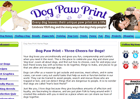 狗爪印(Dog Paw Print)是美国一个关于宠物狗脚印的趣站,是由宠物狗的狂热喜爱者Lori与她的家庭成员共同创建的。Lori认为每只狗的爪印都是独特的“签名”,是不可磨灭的印记。该网站的目的就是希望能与更多爱狗人士分享养狗的乐趣,收集有关养狗的资讯。