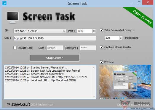ScreenTask 的使用方法也很简单,在IP不妨,需要选择局域网,然后按下Start Server按钮启动,如果你需要设定密码也可以勾选Private Task,然后设定一组密码即可。启动后会显示URL链接,把这个链接通过QQ分享给其他用户即可,如需看到鼠标滑动需啊哟勾选Capture Mouse Pointer,如果播放的不够顺畅可以调整右上角的Mellisecond数值,数字越小更新画面的速度就会越快。