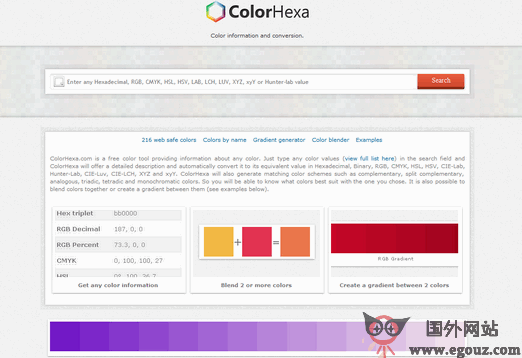 Colorhexa:颜色转换工具是一个免费的颜色工具,提供与任何颜色相关的信息,只需在搜索框输入任意颜色值,就能返回一个详细的描述,并会自动将其转换成对应的十六进制、二进制等。