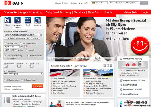 Bahn:德国联邦铁路公司是德国最大的铁路运输公司,欧洲最大的铁路企业,提供在德国境内和连接欧洲其他国家的铁路客货运输服务,是最方便的交通工具莫过于搭乘舒适快捷的火车。