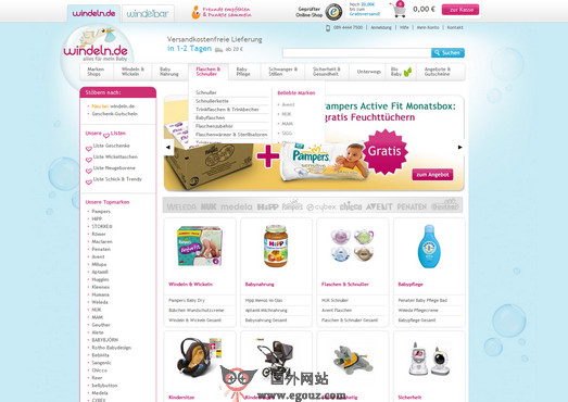 Windeln网站类似于国内的红孩子,专营母婴店出售有帮宝适、新安怡、德国强生等,品类从尿不湿、奶粉奶瓶奶嘴、吸奶器、辅食、温度计等等都可以买到,是一家相对完备的婴幼儿网上商店。