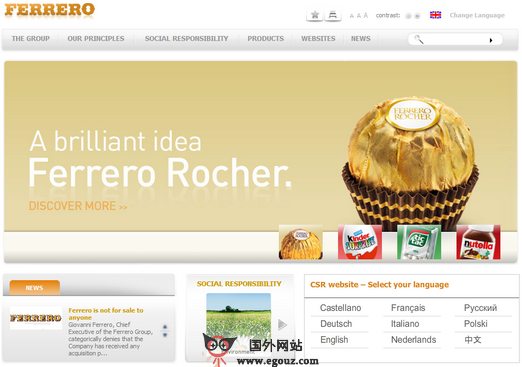 费列罗(FERRERO ROCHER)意大利费列罗集团旗下的产品,其集团是全球第四大巧克力制造商,并拥有一系列优质创新的产品, 费列罗巧克力(FERRERO ROCHER)更是享誉全球的著名品牌。公司于1946年,由Pietro Ferrero先生始创于意大利北部,全力家族式经营,至今第三代,已发展到享誉盛名的跨国集团,并拥有一系列自创的名牌优质产品。