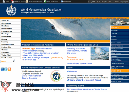 WMO:世界气象组织官方网站是联合国世界气象组织的一个专门机构,成立于1873年的维也纳,是世界各国政府间展开气象业务和气象科学合作活动的国际机构。