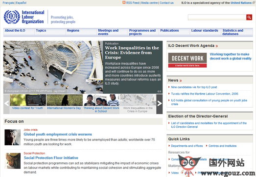 ILO:国际劳工组织官方网站是联合国一个专门机构,重视国际劳工标准的制定,促进会员国对国际劳工公约的批准实施,对维护各国工人和其它劳动者的基本权益起到了积极作用。