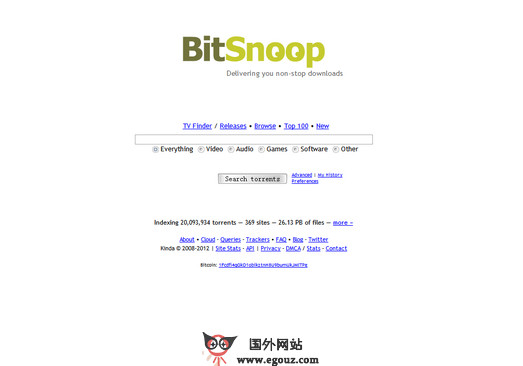BitSnoop:P2P实时有效种子是一个提供海量互联网资源的搜索引擎网站,汇集了众多的互联网种子资源,超快搜索,提供百万级的视频、音乐、游戏、电子书籍、文件等资源。