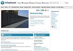 InfoPlease是一个免费的权威百科全书式网站,提供年鉴、地图集、字典、词库,包含体育、娱乐、科技、教育、国际新闻以及美国历史事实,同时提供万年历、拼写检查工具等常用工具。