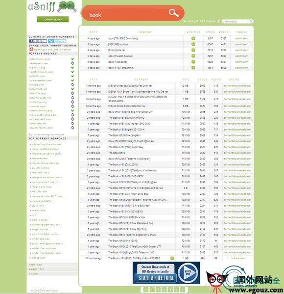 用户只需通过浏览器访问uSniff.com,在输入框中输入你想要搜索的关键字即可。网站还推出支持Firefox 2+ 和Internet Explorer 7+浏览器插件,让BT搜索更方便。