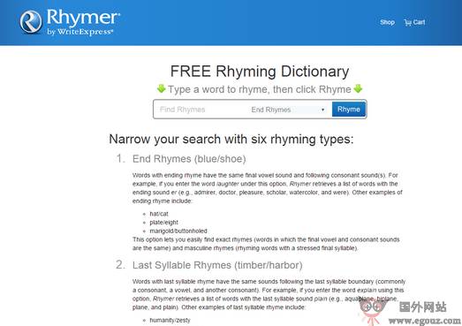 Rhymer 网站提供在线押韵单词搜索和离线版的查询工具,在线版免费使用,离线版工具就需要收费了。在线版的使用方法很简单了,用户只需要输入想要查询的英语单词即可查询到相关押韵的其他英语单词,同时还支持6种不同的搜索方式,自行研究吧。