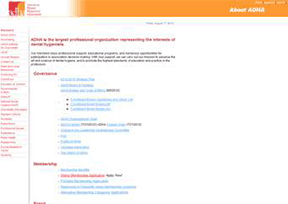 美国牙科卫生师学会(American Dental Hygienists Association)是美国最大的牙科卫生师的专业组织,拥有超过150000的牙科卫生师,总部设在芝加哥。牙科卫生师是专业性的预防口腔健康并得到口腔卫生学证书的专业人员,主要提供教育性、临床性及治疗性的口腔健康服务。