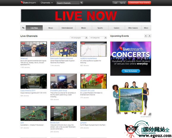 Livestream是一个网络技术领先的实时视频广播平台,由爱好者、名人、艺术家等用户使用。栏目包括:新闻、游戏、音乐、体育等。Livestream是这个行业的首个价格相对便宜的,无限制的,没有广告的,端到端的高清现场视频流解决方案。