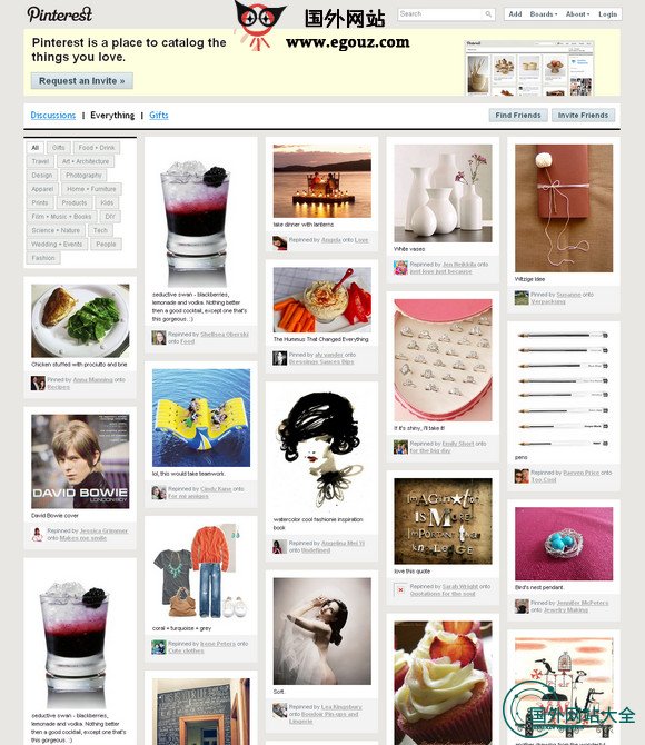 Pinterest目前采用邀请制,可以赴首页申请邀请码。Pinterest目前没有iOS应用,而且不支持中文。Google的扩展库里有pinterest插件。