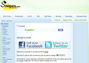 Snopes美国知名的揭穿谣言和传闻的网站,用“真”、“假”或“不确定”来标注传闻的真实性。
