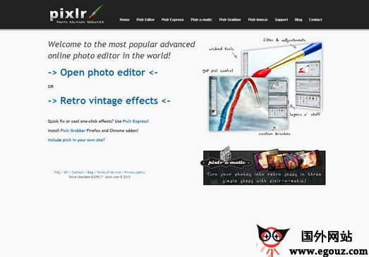 Pixlr:在线图片编辑工具是一个来自瑞典基于Flash的免费在线图片处理网站。如果你手边刚好有照片需要处理,而正使用的电脑却没安装任何图片处理软件,没关系!