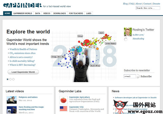 GapMinder:在线互动图表数据平台是一个将国际统计数据转换成活动的、交互的和有趣的图表,以在线统计数据为基础的互动图表集的完美世界。目的是通过增进对可以自由访问的公共统计数据的使用和理解,以促进以事实为基础的世界观察。