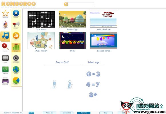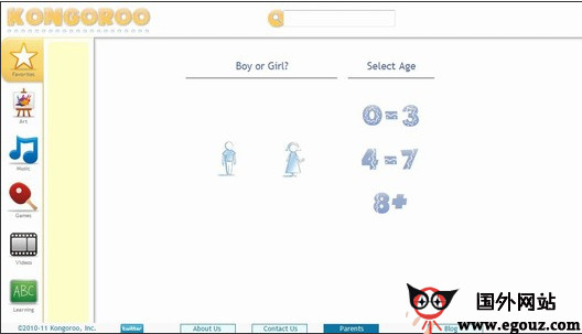 Kongoroo:儿童设计作品搜索引擎分为绘画,游戏,学习、音乐、影片五大项,而每个大项里又细分出六小项,所以内容相当丰富,更贴心的是它会依照小朋友的性别和年纪列出适合的服务出来,所以家长们可以放心的让孩子们安全的访问和探索。