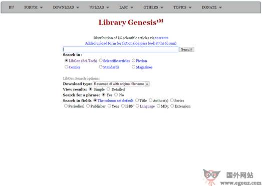 Library Genesis 网站是一个支持免费下载电子书籍的图书索引库,提供科技、科学文章、小说。漫画、杂志等书籍,可根据作者、期刊号、出版者、书号、语言等进行选项进行搜索并下载到本地。
