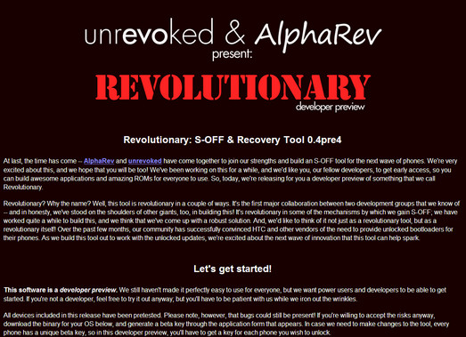 Revolutionary工具是由两个开发小组整合到一起开发出来的全新的工具,他们的最终目的不仅仅是解锁,而是要htc厂商提供官方的解锁工具,让htc手机爱好者有更好的使用空间。