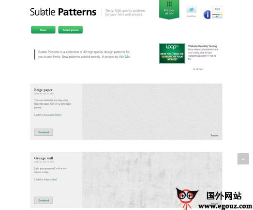 Subtlepatterns:免费背景素材下载网是一个非常实用的高品质背景素材网站,提供大量pattern背景素材供使用者免费下载使用,pattern就是重复不断出现的图案,称为平铺式背景图。