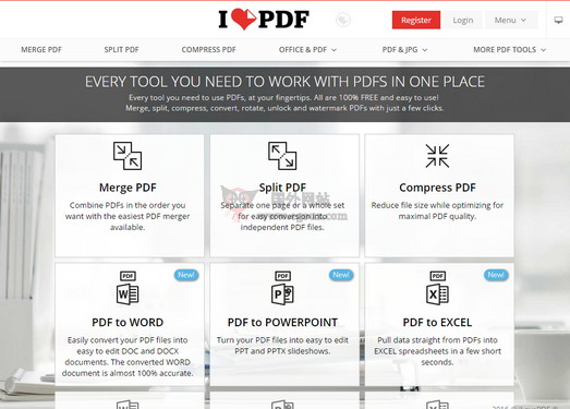 I Love PDF 是一个有关于PDF文件的整合工具集合,提供合并、分割、压缩、转档、加入页码、浮水印、密码破解、旋转文件等服务,无需安装软件和任何插件,直接在线就可以完成。