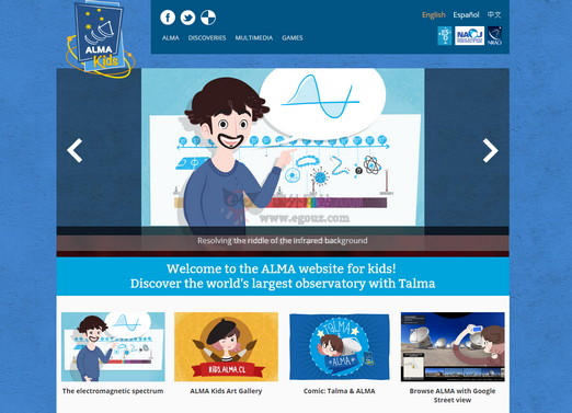 Alma Kids 是由ALMA天文台为儿童认识宇宙而创办的科普站点,通过大量的图片、文字和互动内容来探索最为神秘的宇宙空间,大家都爱看星星,也爱看银河,欣赏大自然之美或许是人的本能。通过该网站可以激起孩子们的好奇心,了解更多的宇宙知识。