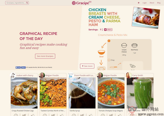 Gracipe 网站是一个把美食制作的配方和制作过程完全科学流程化的网站,当你在根据美食配方制作美食的时候,把手机或者笔记本电脑带进厨房,根据Gracipe提供的每一个步骤严格执行,整个制作流程完成后,最佳的美食就出锅了。