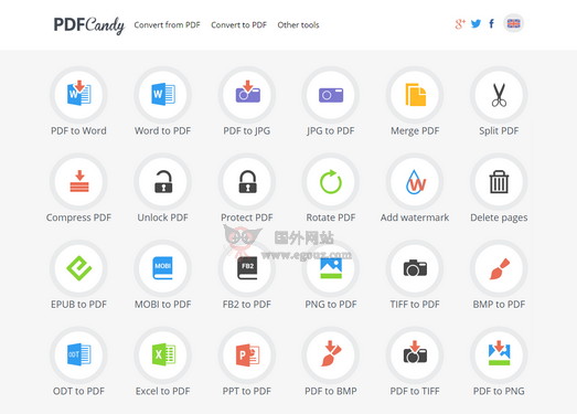 PDFCandy 是一个汇集了许多常用PDF工具的免费在线服务,主要分成三大类包括将PDF转成其他格式(Word、JPG、PNG、TIFF和BMP),将各种格式转为PDF档,还有合并、分离、压缩、解锁、密码保护、旋转、加上浮水印和删除页面等功能。