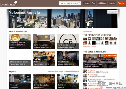 Beanhunter 网站是一个与咖啡有关的站点,帮助喜欢喝咖啡的用户找到世界上最好的咖啡馆,不同的国家和城市都有不同口味的咖啡,这是一种城市化的咖啡文化,无论你哪个城市,Beanhunter都会为你找到最好和的咖啡馆。