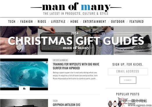 Manofmany:男士文化生活博客是一个展示男士产品、文化、时尚、科技的博客网站,由悉尼的两个有共同爱好的人创办于2012年,该团队喜欢为读者引入新鲜、刺激和独特的品牌故事,通过创新设计、潮流风格和永恒经典为主题。