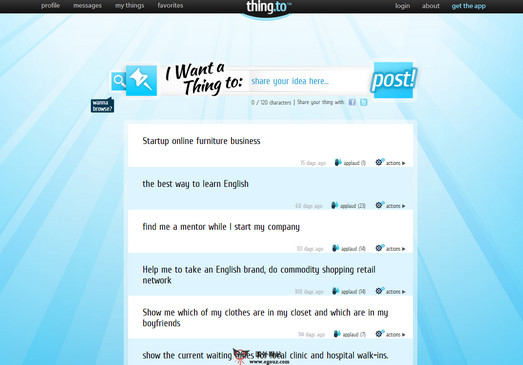 Thing.to:在线奇思妙想点子社区是一个发布自己的创意想法的平台,为那些拥有天马行空的幻想家和有着各式千奇百怪的创意的人群提供的一个分享创意的网站。