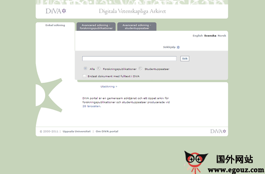 Diva-Portal 学术档案数据库拥有英语、瑞典语、挪威语界面,暂不支持中文。