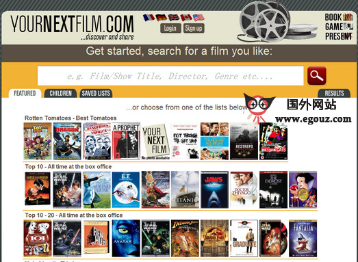 YourNextFilm:最佳电影是一个帮助用户寻找最喜欢的电影的搜索引擎网站,可以针对电影的关键字、流派、风格、演员等分类进行筛选式搜索。