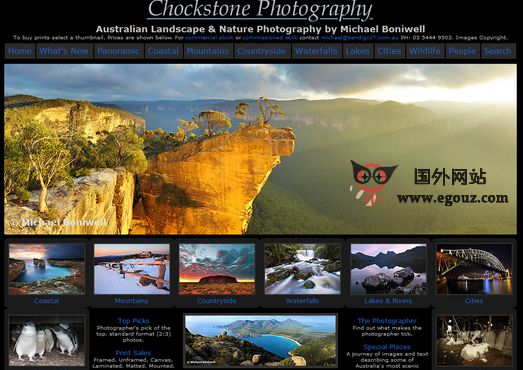 ChockStonePhotos:澳大利亚自然风景摄影是一个有关澳大利亚自然景观的网站,网站图片出自摄影师Michael Boniwell之手。在这里,你能欣赏澳大利亚美丽的自然风光,如黄金海岸、大堡礁等。