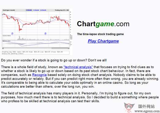 ChartGame:在线模拟投资游戏网是一个由Matthias Wandel工程师研发的模拟投资游戏,为了测试技术分析能不能打败买进持有策略(Buy and Hole)而开发的游戏,身为一个技术分析者,最基本的业绩就是超越买进持有策略。
