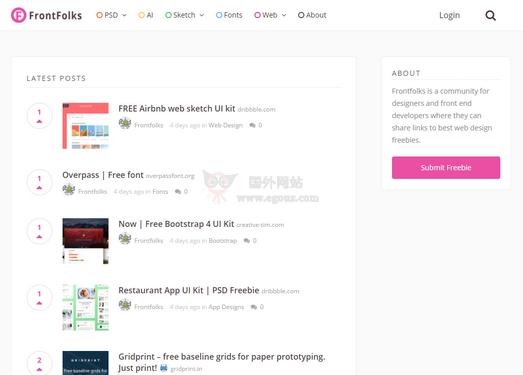 Front Folks 是iyige专门针对设计师和前端开发人员的社区,共享高品质网页设计模版、PSD文件、草图、免费字体等资源,用户也可以在这里提交自己的设计作品,如果你想要找一些国内没有的设计UI资源,不妨收藏该网站。