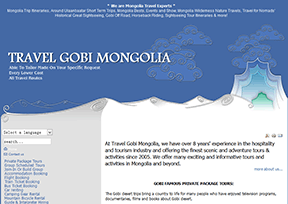 蒙古Gobi旅行社(Travel Gobi Mongolia)是蒙古国最大的旅行社,于2005年成立,主要为游客提供优质的蒙古导游服务。该网站为其官方网站,也是蒙古最大的旅游门户网站。