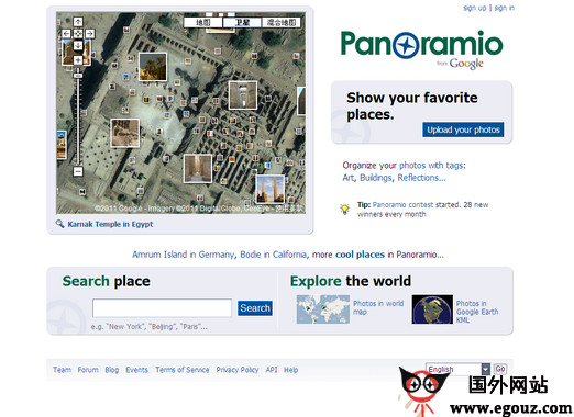 Panoramio:基于地理位置图片分享平台隶属于Google的免费照片上传网站,提供2G的相册空间,单张照片最大10M。