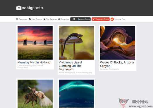 One Big Photo 是一个致力于摄影作品每日分享的站点,一张大图胜过于千言万语,摄影的境界就在于不断的从世界上挖掘感动人心的镜头,该网站主要分类有自然风景、动植物、城市、太空等,你不仅可以欣赏来自世界各地的摄影师提交的作品,还可以把自己的摄影作品提交上去展示。