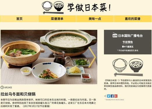 "学做日本菜"是由日本NHK创办的多语言日本美食教学网站,该网站由日本料理专家"渡边 Akiko"主讲,网站上提供令人垂涎的日本家常菜的菜谱,荟萃日本料理的传统。
