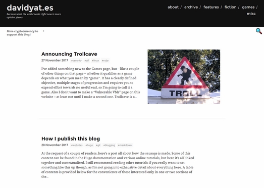 David Yates 的日常工作是致力于信息安全方面的研究,并且对独立游戏有着长期的热情,尤其是那些陷入叙事逻辑类的游戏,而且博主还会自己制作,喜欢研究互联网的用户不妨订阅该博客,你会获取到博主研究网络文化、变成和软件的相关文章。