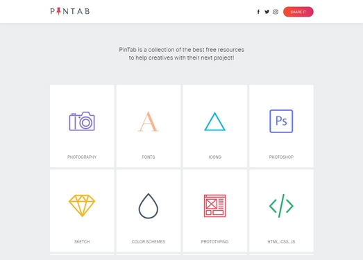 Pin Tab 是一个专门为创意工作者收集整理的免费资源集合,看帮助他们在进行项目工作的时候找到更多的创意,同时还可以利用各种工具进行深加工,资源包括摄影、字体、图标、草图、配色方案、原型图、html等。