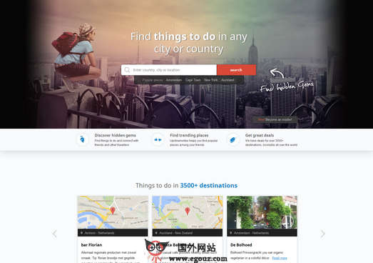 TripGems:在线旅游地发现分享平台是一个基于旅游分享的网站,提供世界各地的旅游景点介绍、旅游地特色,旅游航班搜索、酒店预订等服务,是目前流行的旅游自助游流行的旅游网站之一。