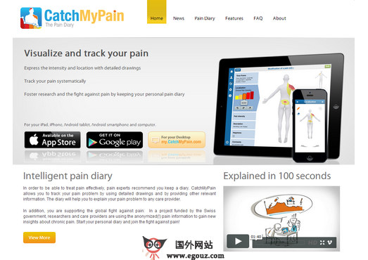 生病过程中,由于疼痛是有多种原因引起的复杂的机理,随着时间的推移,疼痛会移动或者扩张到身体的不同位置,疼痛的强度也会有所不同,如何来监控这个过程?有专家提出了采用写日记的方式来记录并监控,让医生通过你的日记来了解你的痛苦,CatchMyPain应用是一个智能的疼痛日记工具,能够通过可视化的模式来记录和描述你的问题,让医生更加的了解你的病因。