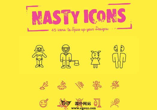NastyIcons:讨厌的图标免费素材分享网是一个提供了免费的45个图标集合,设计师们可以自由使用在任何地方,例如T恤、网站、版面设计等商业用途上,优秀的创意图标非常适合休闲网站的使用。