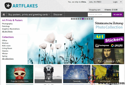 Artflakes:在线艺术作品交易平台是一个专门针对艺术家们出售作品,寻找创意、灵感的交流和交易平台,除了购买和出售外该网站还提供打印服务,把你购买的作品打印出来。