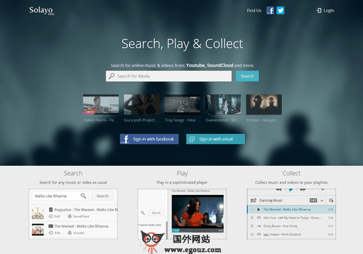 SoLaYo:在线流媒体视频聚合网是一个基于互联网视频资源的视频聚合流媒体服务网站,其形态酷似Spotify的第三方网站的整合版,它聚合了 、Dailymotion(视频分享网站)和 SondCloud(音频分享平台)上的内容。目前无任何版权内容。