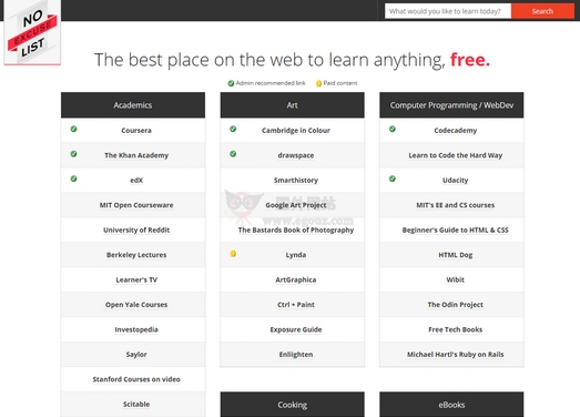 No Excuse List 网站仅有一个页面,住管理员添加推荐的链接,主要包括艺术类、计算机编程、各大开放大学入口、烹饪类、电子书籍、DIY教学、语言类、音乐类等,标注有绿色对勾的标识为免费的,标注为圆形货币的为收费类型。