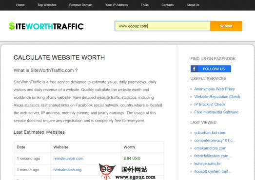 SiteWorthTraffic:在线网站流量价值评估网是一个免费的网站评估服务,旨在针对不同的网站流量进行评估计算网站收入,统计日浏览量,每天游客和日常收入的工具网站。