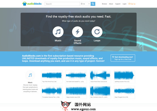 AudioBlocks:基于订阅的免版税音效平台是一个提供收费音效、音乐片段、音乐曲目的订阅式音乐资源分享社区,需要注册才并付费能下载,里面的音效种类非常丰富,该网站的目的就是为用户提供高品质的数字音效资源。