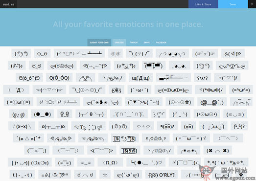 EmotES网站是一个收录各种日本颜文字表情符号的站点,可以让用户很轻松的复制粘贴来使用这些个性化的表情,除了收录颜文字外还收录了Twitch、Skype、Facebook 表情图案。