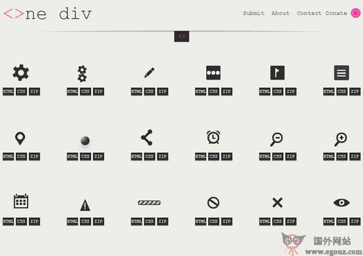 One DIV 的图标每天都有新增,目前已有 50 多个图标,并且每个图标都可以在线查看它的 HTML 和 CSS 代码,或者直接下载使用,对于初学网页设计的用户来说能够找到一些代码案例并可以应用于自己的网页设计中去。